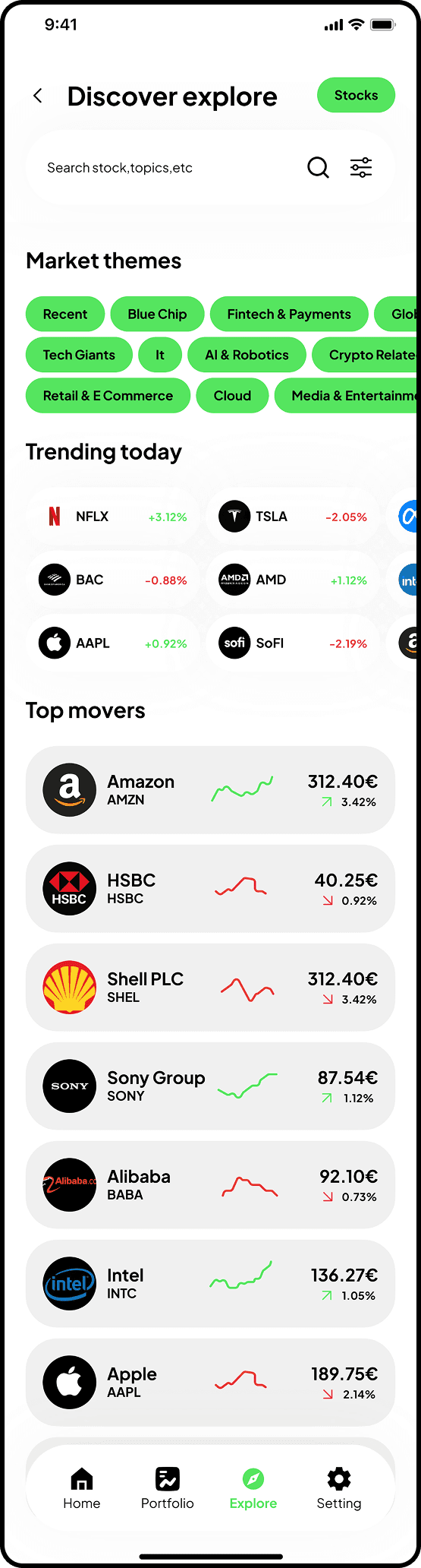 Flexible navigation: market themes (Fintech, AI, Cloud), trending stocks, top movers.