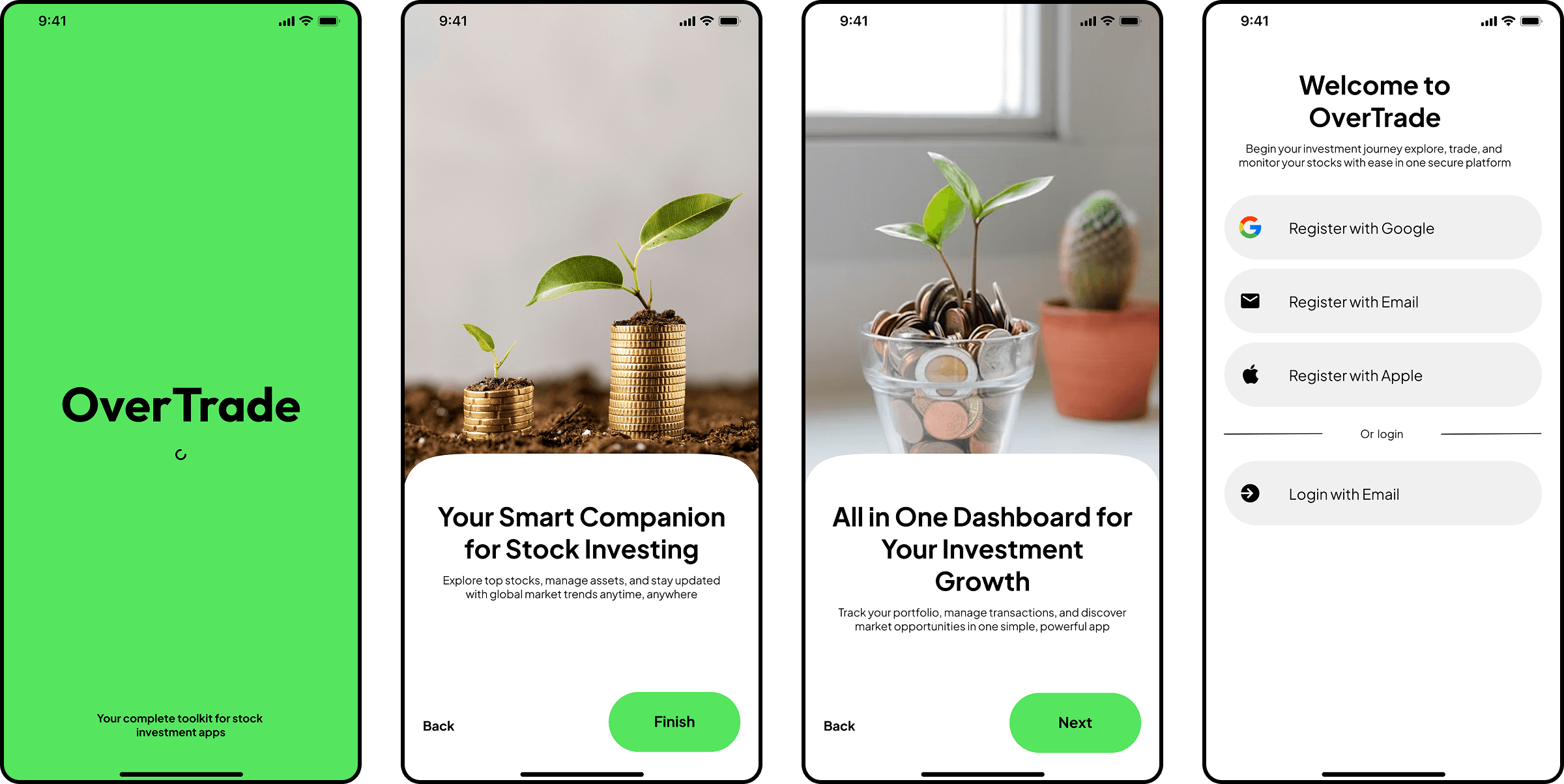 Splash (signature green) → 2 storytelling photo screens (growth) → Multi-option login. No friction. No forced tutorial.