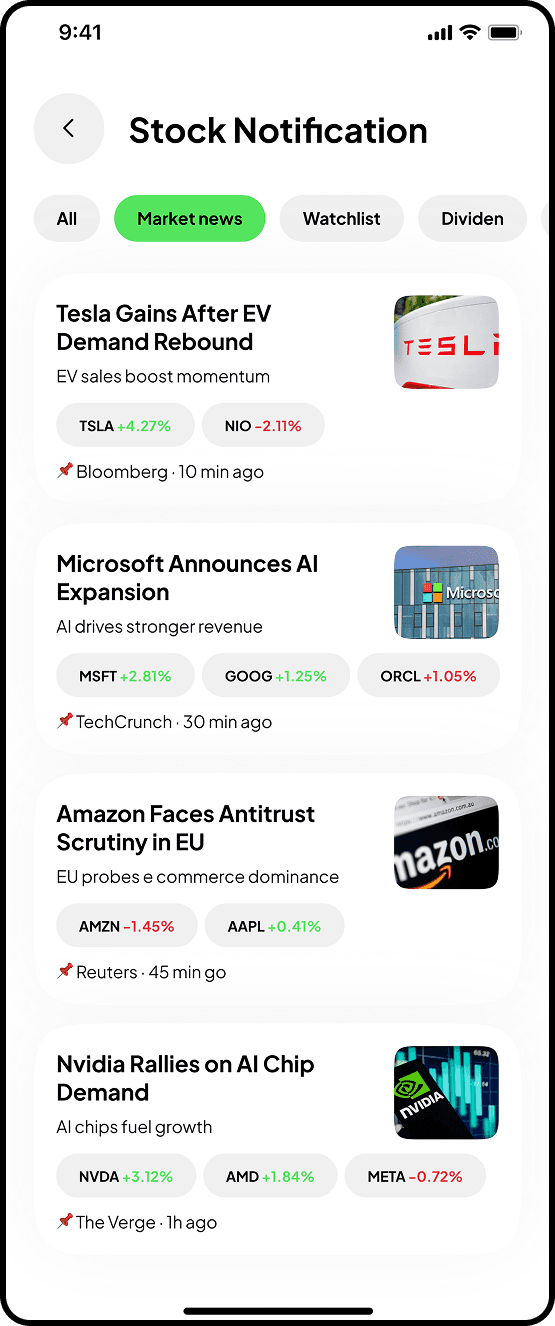News aggregated by category (market, watchlist, dividends). Variations displayed directly in cards.