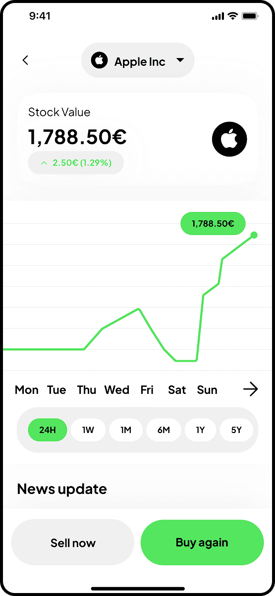 Current value + evolution. Interactive line chart. Contextualized "Sell now" / "Buy again" CTAs.