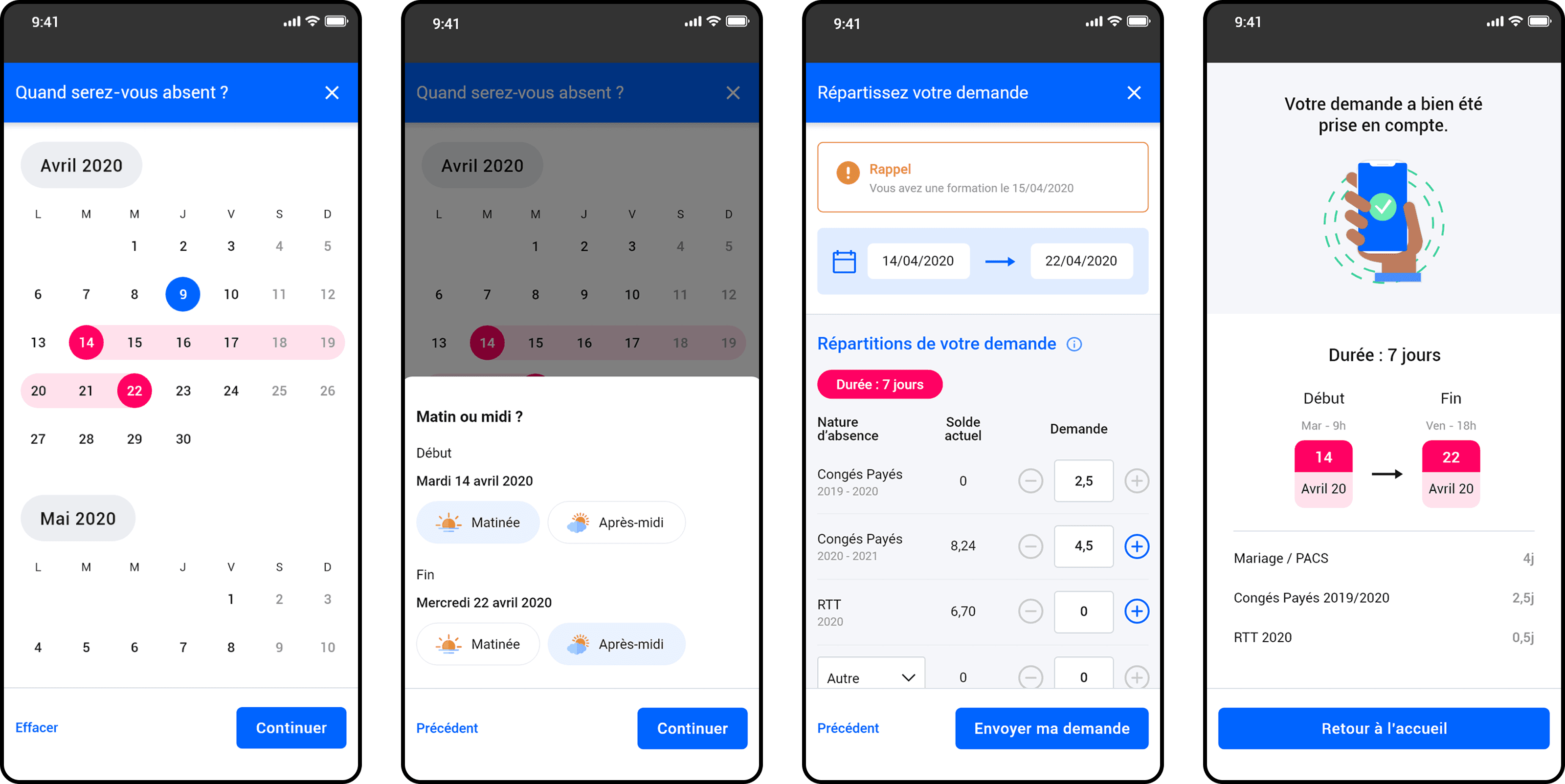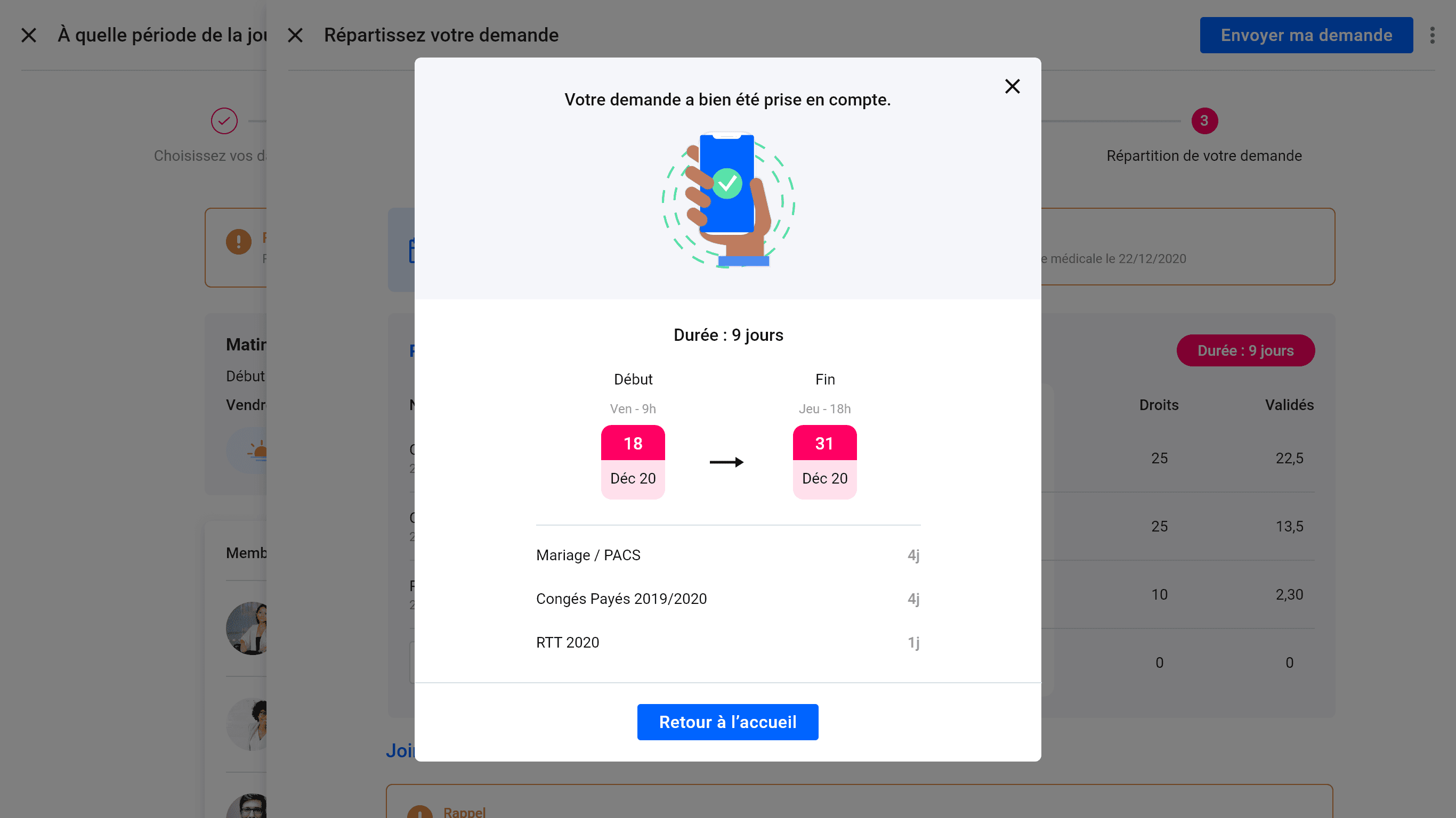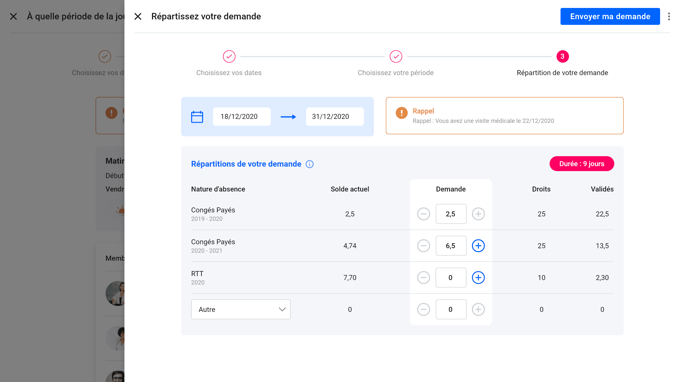 Multiple types of leave (vacation, RTT, marriage/civil union, other). Badge “Duration: 9 days.”
