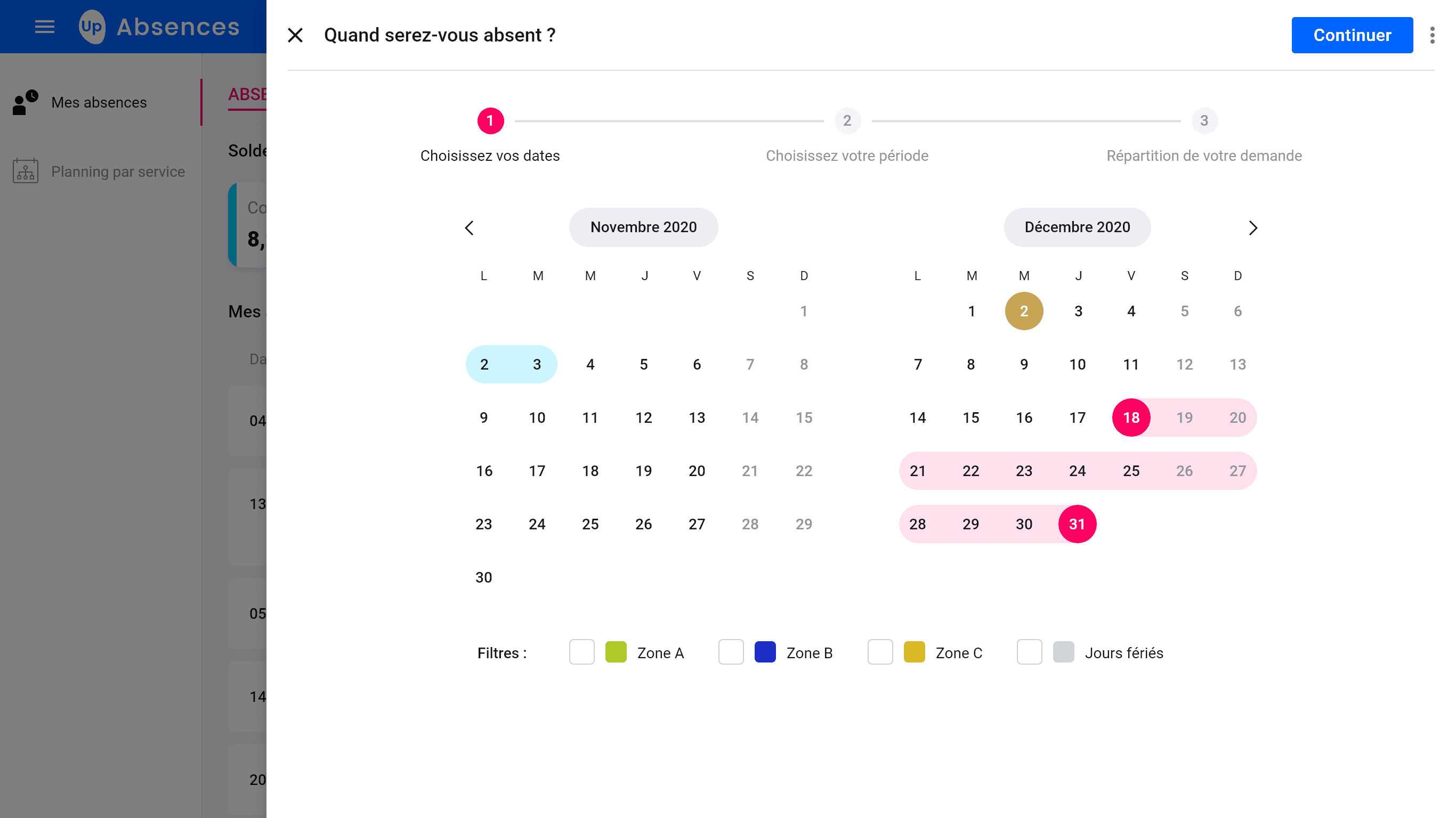 Double month calendar with smart filters (Zones A/B/C + Public holidays).